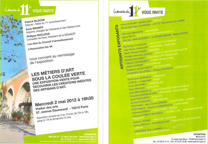 Organisée par la marie du 11ème arrondissement de Paris et l'association les 4A, venez nous retrouver à cette exposition-vente pour découvrir certaines de nos créations ainsi que celles d'autres artisans d'art.