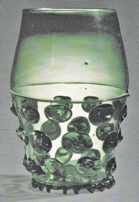 La base est renforcée par un anneau travaillé au fer, un décor nettement indiqué avec un filet de verre à mi hauteur et trois rangées de gouttes de verre ou prunts.