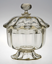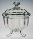 Soufflée dans un moule avec un décor de godrons et un bouton spiraloïde, cette bonbonnière reprend des formes classiques de compotiers et de confituriers fabriqués dans la première moitié du XVIIIème siècle.